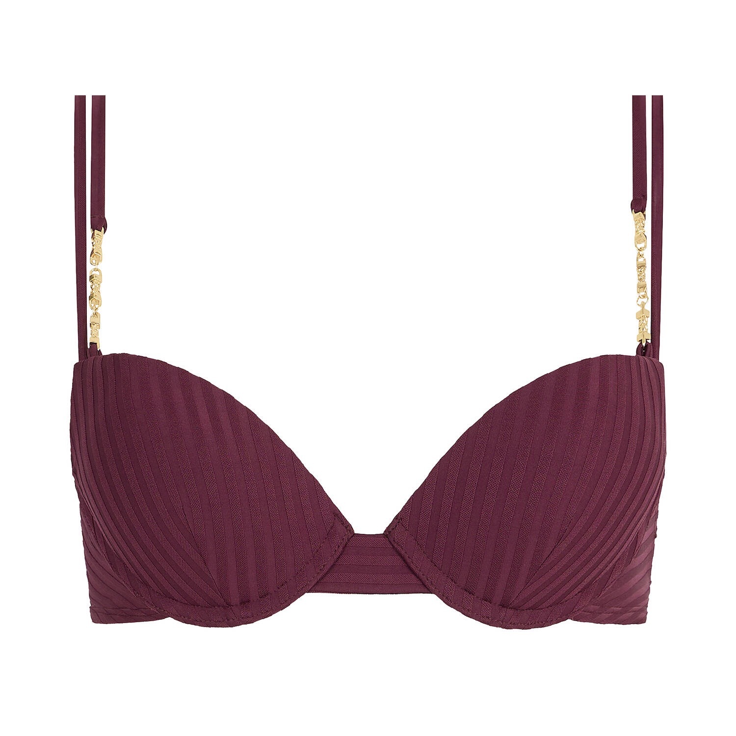 ・「サン・ポップ」プッシュアップ・ビキニトップ(アサイー)は、深みのある洗練されたプラムカラーが特徴です。リブ編みの生地がネックラインに質感とモダンな魅力を添えています。一体型カップがバストを美しく整え、自然なボリューム感を生み出します。