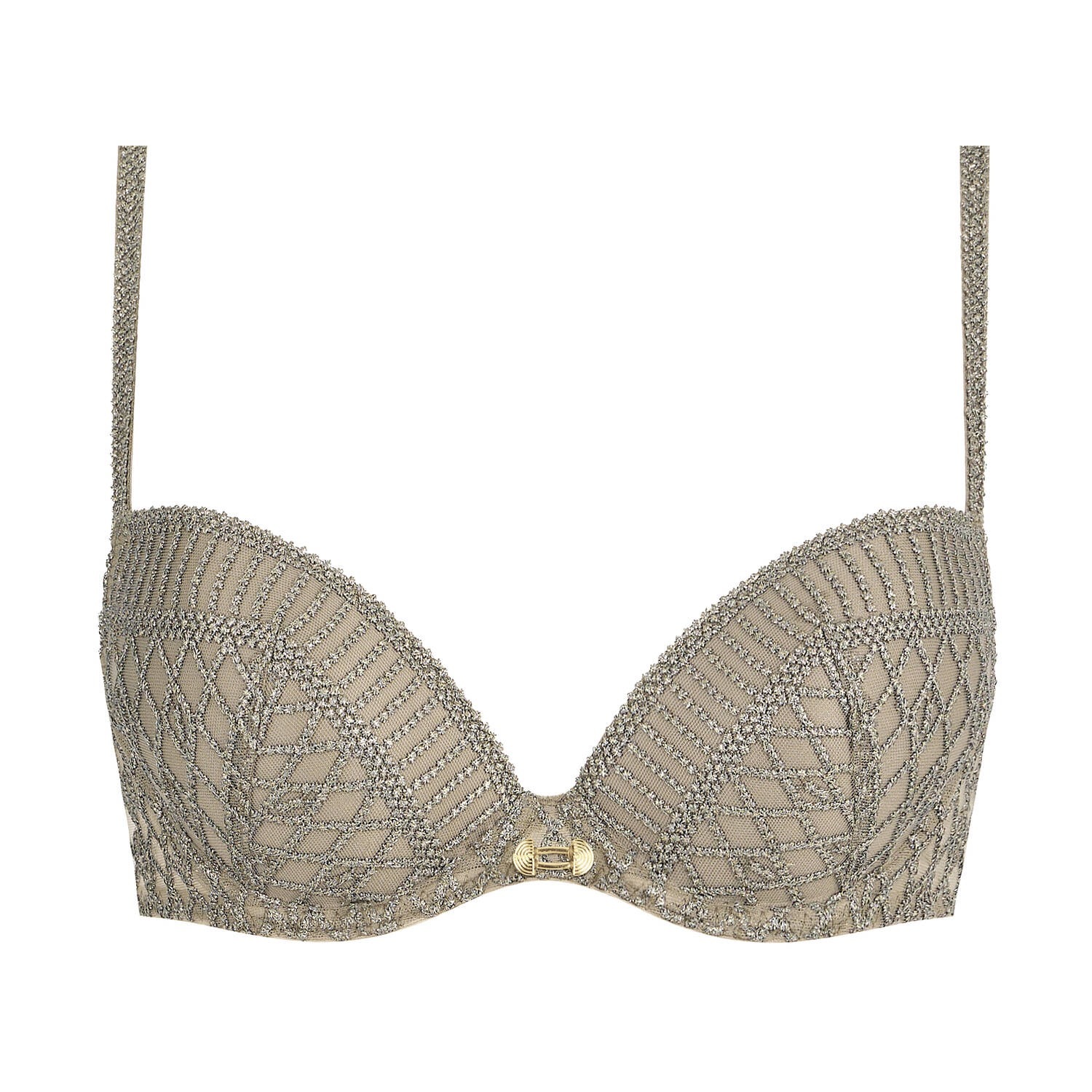 「スターダスト・ドリーム」のモールド・プランジブラは、非常に自然で快適なプッシュアップ効果を生み出し、虹色に輝く刺繍をあしらった透け感のあるメッシュと、不透明なモールドカップとのコントラストが特徴です。ストラップにまで続く刺繍が施された目を引くパネルがデコルテを引き立て、カップの間には際立ってセクシーなゴールドのチャームがあしらわれています。