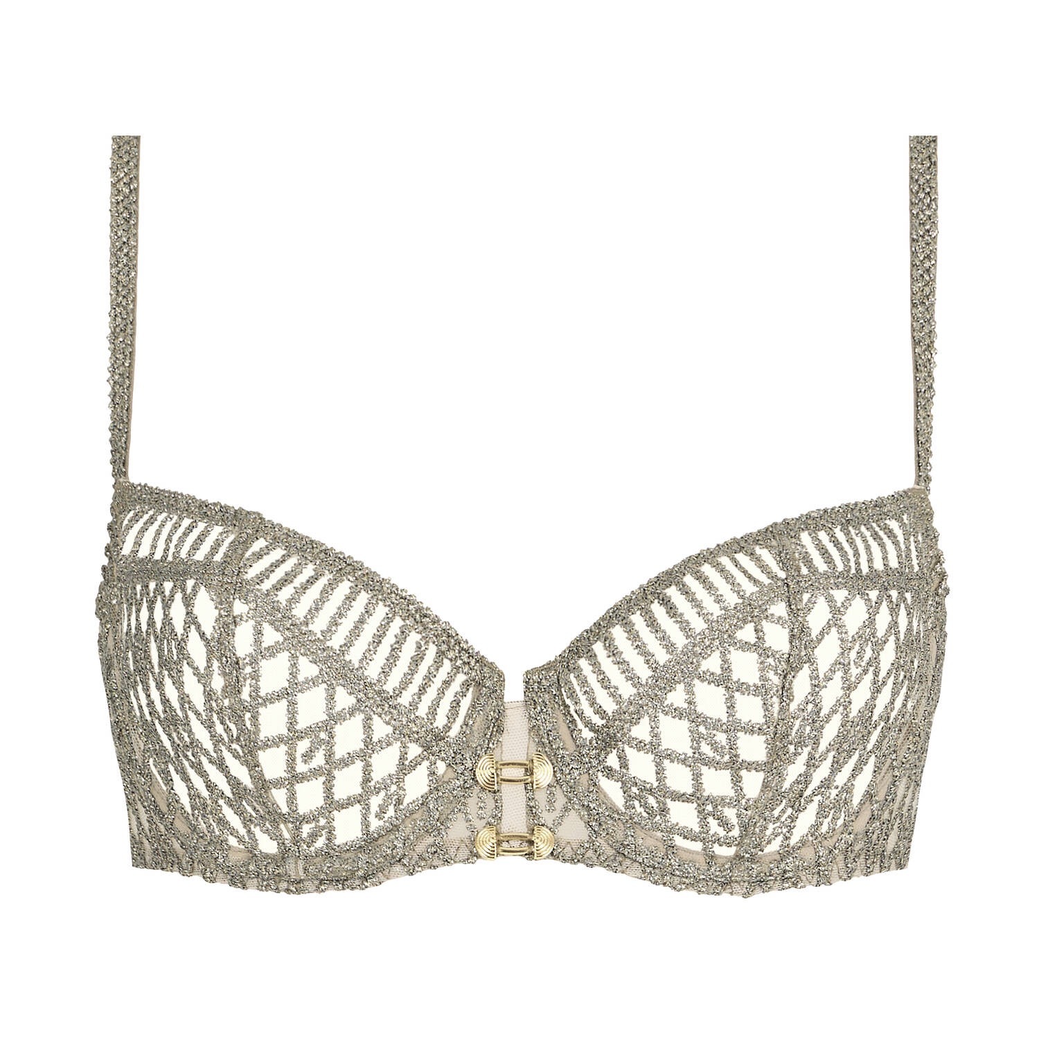 モダンでセクシーなスクエアネックラインが特徴の「スターダスト・ドリーム」アンダーワイヤー・ハーフカップブラは、カップの間にきらめくチャームがアクセントとなり、バストを丸みを帯びたふっくらとした形に美しく整えます。背中のストラップは付け根で2つに分かれており、非常にユニークで目を引くデザインとなっています。