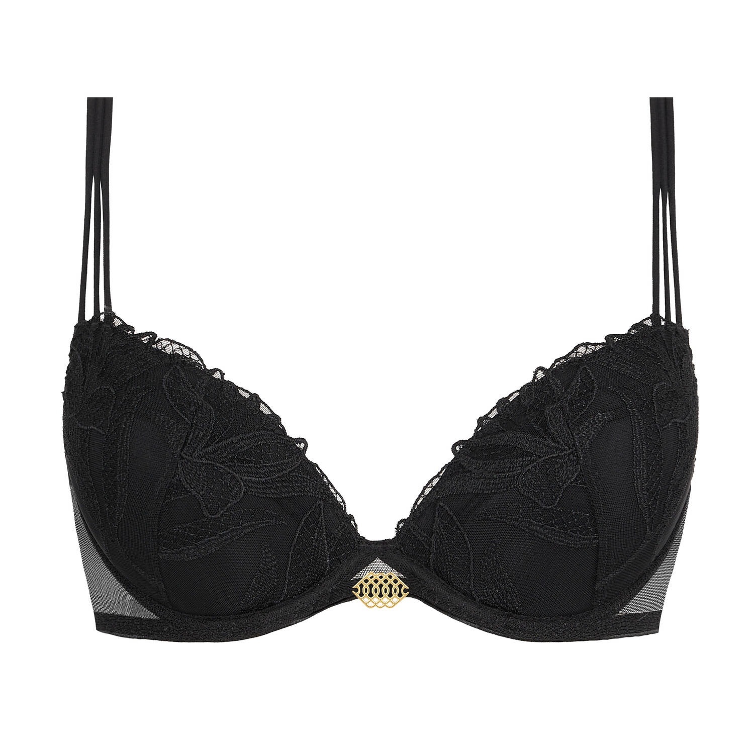 「Sweet Euphoria」のブラック・プッシュアップブラは、取り外し可能なパッドにより、深く魅惑的なデコルテラインを演出します。内蔵のパッドがバストをさりげなく美しく整え、花柄の刺繍が官能的なデザインを引き立てます。