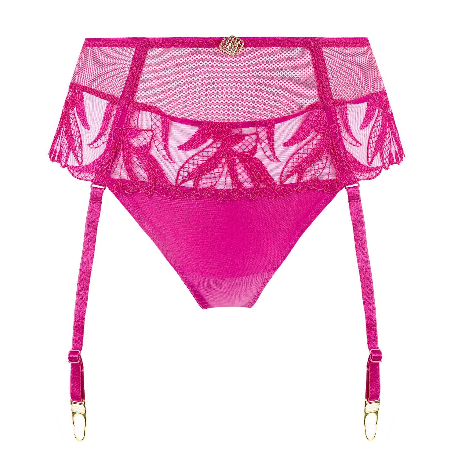 「Sweet Euphoria」のパッションローズ・ガーターストリングは、自信に満ちた色気を放ちます。鮮やかなピンク色が視線を惹きつけ、大胆なグラフィックデザインがシルエットを引き立てます。