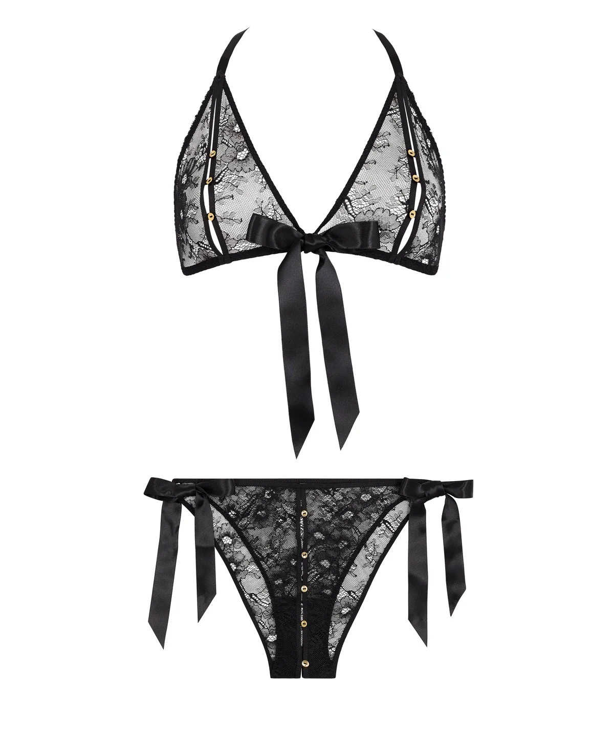 上質なフローラルレースを使用し、肌をさりげなく覗かせながら、自信に満ちた官能美を際立たせます。柔らかなトライアングルブラとミニブリーフで構成され、ゴールドのボタンと調節可能なサテンリボンが、誘惑的な魅力を演出します。ワイヤーなしのトライアングルブラは、バストの自然なラインに沿ってしなやかで官能的なフィット感を実現します。サイズ調整可能なワンサイズ設計で、体の曲線に美しくフィットします。