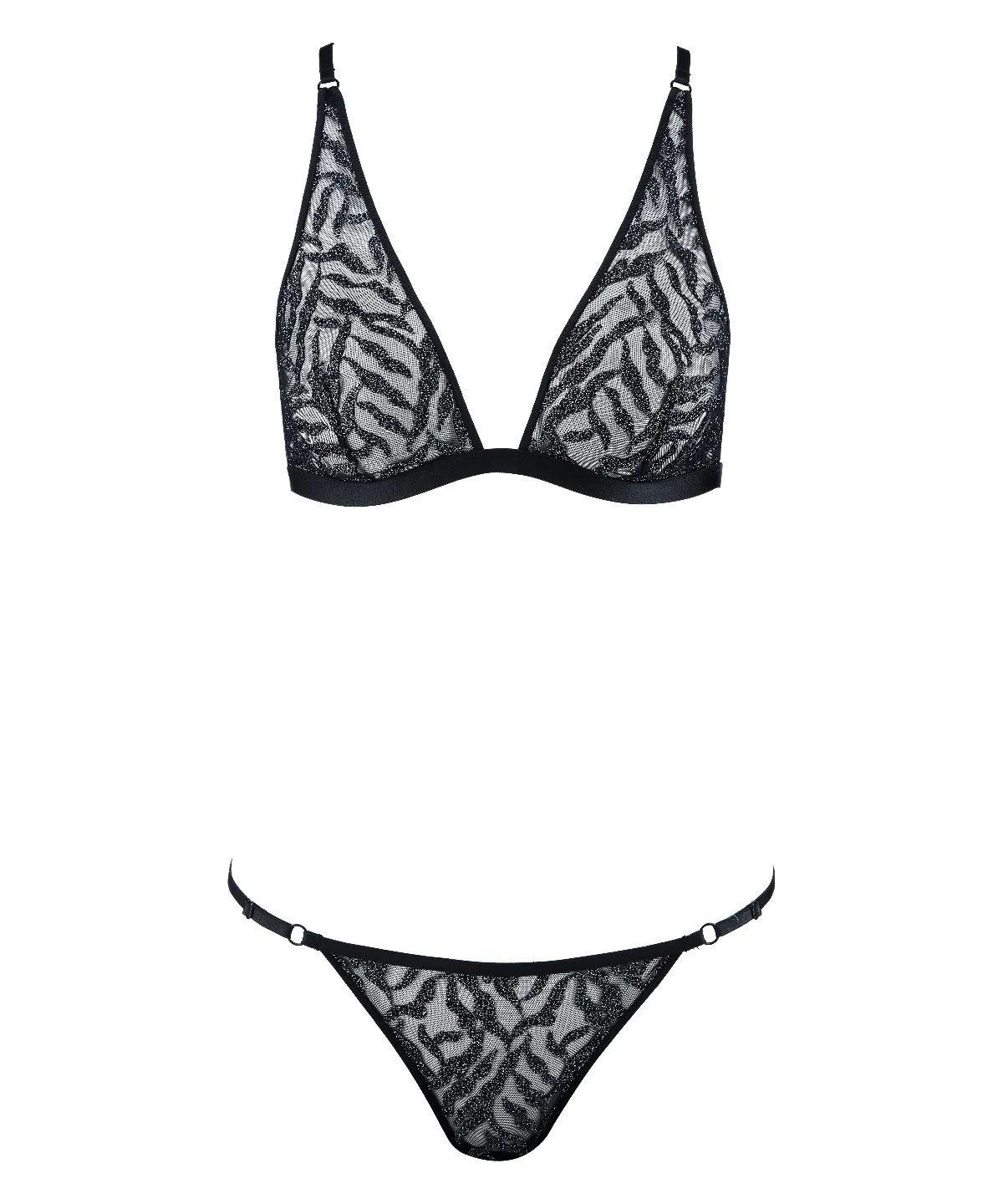銀色の波模様が織りなす独創的な刺繍をあしらった「ムーンライト・シャドウ」セットは、トップスとボトムスのコーディネートセットです。モダンなデザインのワイヤーなしブラレットは、深くセクシーなデコルテラインを演出します。服の下でも目立たないミニハートショーツは、日常的に快適に着用できるよう設計された、スタイルを美しく見せるデザインです。
