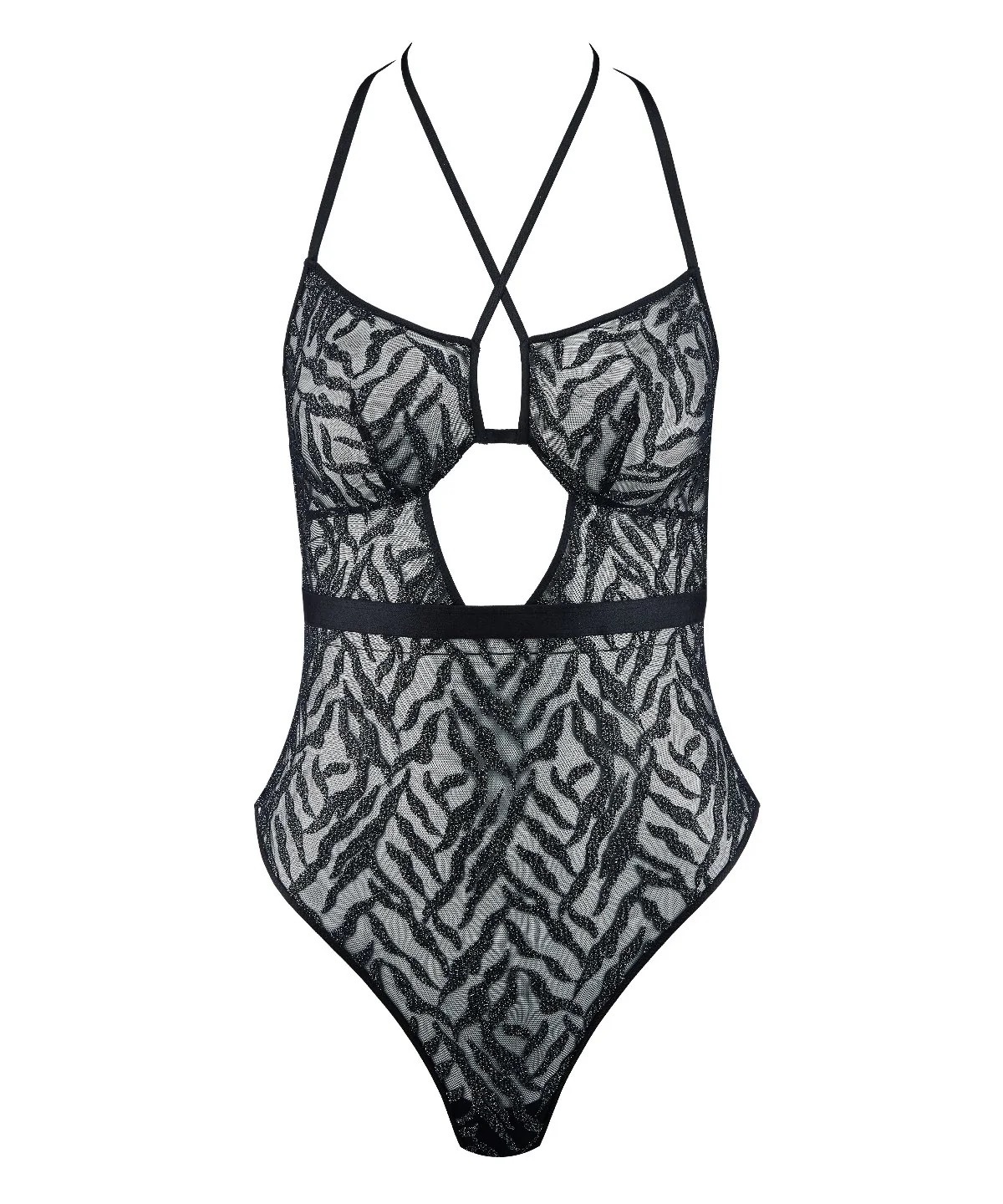 非常に魅力的な「ムーンライト・シャドウ」ボディは、エレガントさとモダンさを兼ね備えたメタリック刺繍でバストを彩ります。ウエストを美しく引き締め、カットアウトとセクシーな紐の組み合わせが際立たせる深いデコルテが特徴です。背面は、現代的なグラフィックなフォルムで巧みに構成された、息をのむような大胆なバックレスデザインとなっています。