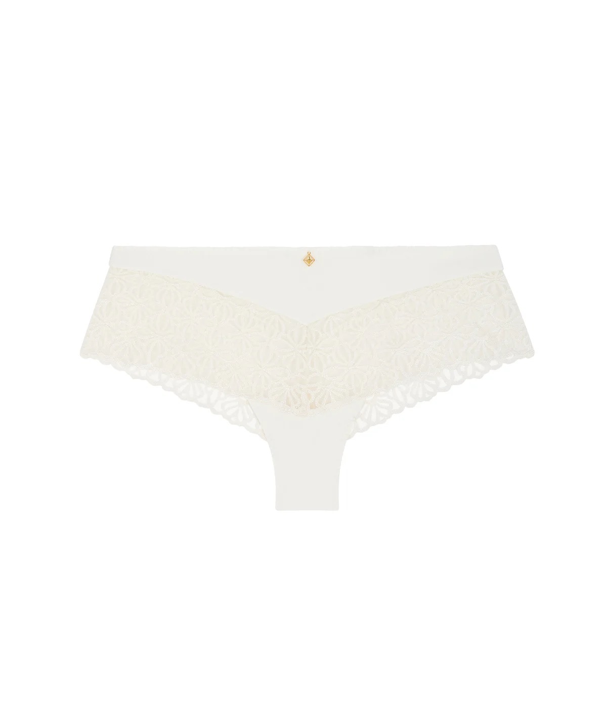 「Secret Memories Ivory」ショーツは、柔らかなタッチとモダンなデザインでボディラインを美しく包み込みます。トーン・オン・トーンの刺繍がヒップラインに繊細なグラフィック模様を描き出し、フレンチメッシュ素材が適度な透け感と快適な着心地を実現しています。ボディを優しく包み込むシルエットは、安心感のあるカバー力を保ちつつ、女性らしくエレガントな佇まいを演出します。シグネチャーであるサテンリボンがウエストをさりげなく強調し、このアイテムのクチュール的な個性を引き立てます。控えめな色氣と日々の快適さを両立させるようデザインされた一着です。