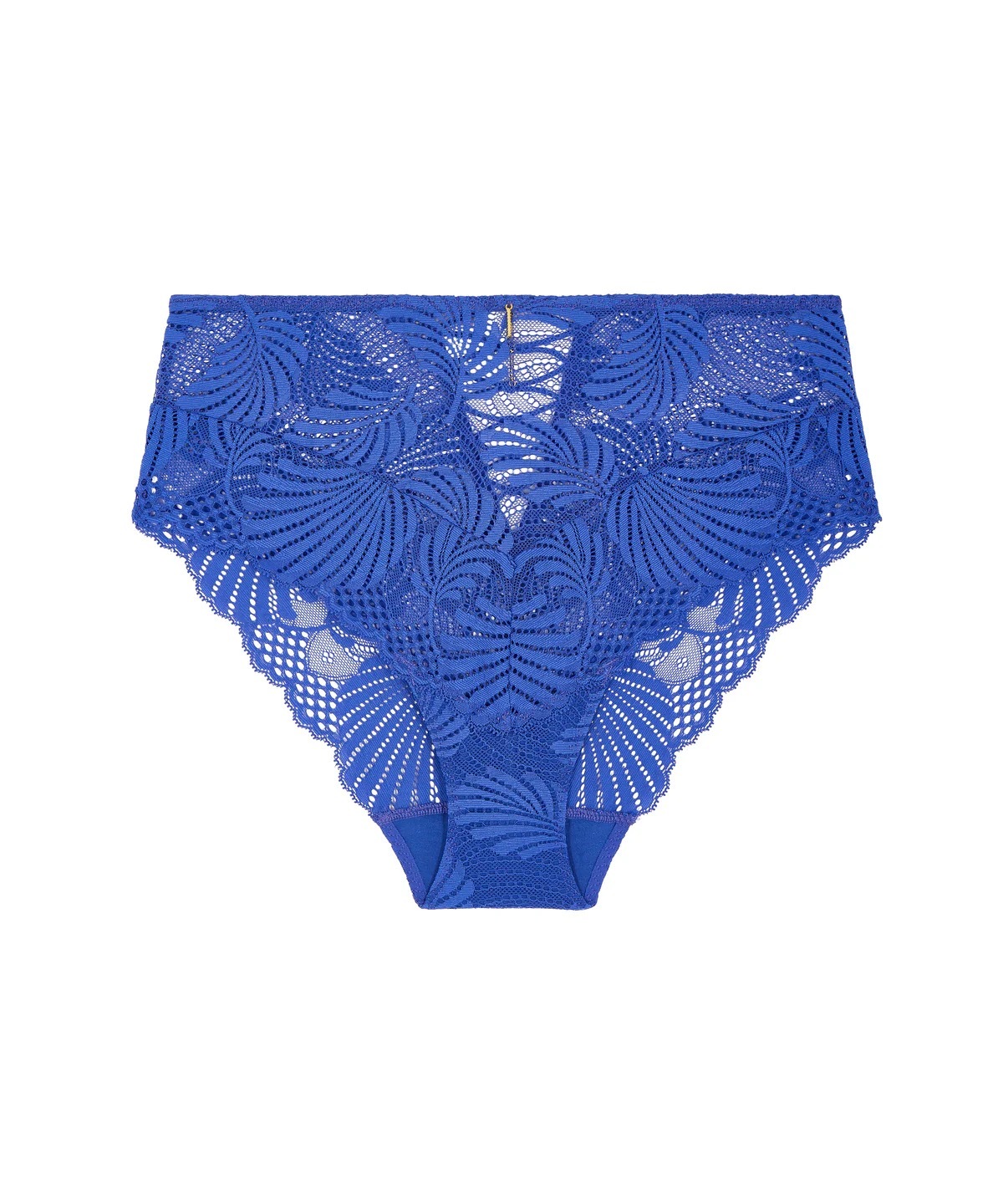 ヒップを美しく引き締める、着心地良くカバー力のあるシルエットが特徴の「Rhythm of Desire」ハイウエストショーツは、豊かなヤシの葉のモチーフをあしらったセクシーなレースをふんだんに用いています。背中の紐の結び目が腰のくびれをさりげなく見せ、ヒップの曲線を際立たせ、断然魅力的なシルエットを演出します。
