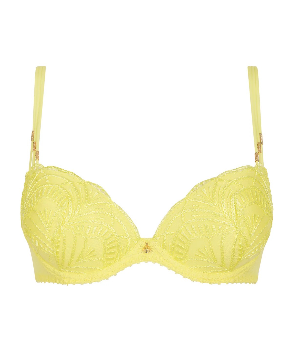 セクシーでありながら自然で快適なプッシュアップ効果を生み出す、Vibesのカップ付きプランジブラは、息をのむようなデコルテラインを演出します。一体型カップによる不透明と透明のコントラストが際立つデザインで、ゴールドのアクセントや、バスト部分で細く分かれるストラップといった魅惑的なディテールが施されています。