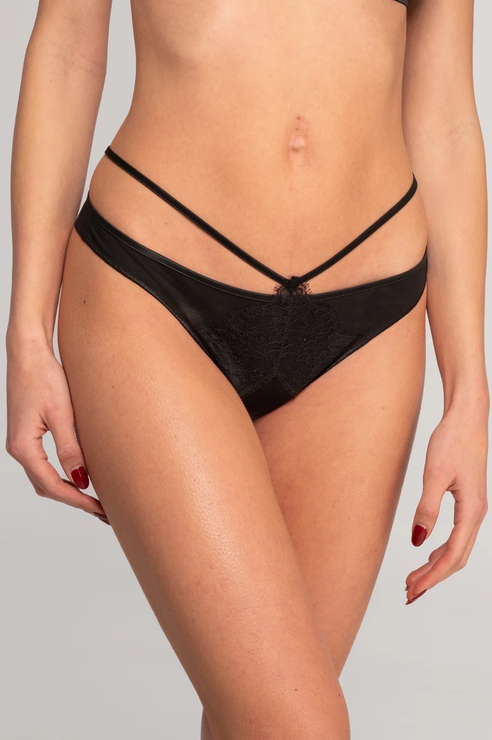 超軽量で伸縮性に優れたチュール生地を使用したブラジリアンカットのブリーフ。サテンのトリムとリボンで仕上げられています。フロントには、エレガントな花柄をあしらった上品なフレンチ・シャンティリーレースが施され、洗練されたフェミニンな雰囲気を演出しています。
