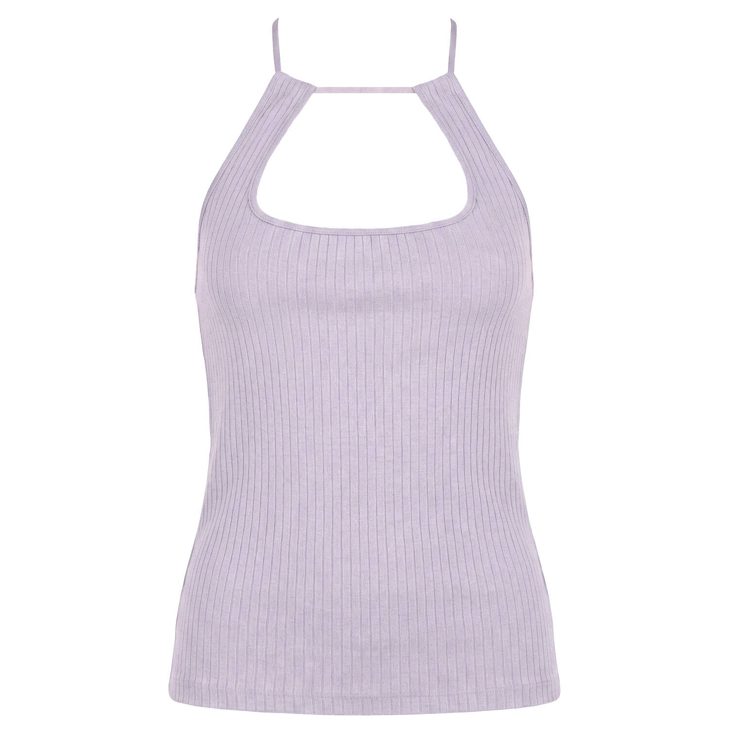 デコルテ部分にキーホールディテールをあしらい、背面にリボン結びの留め具を施したノースリーブトップス。