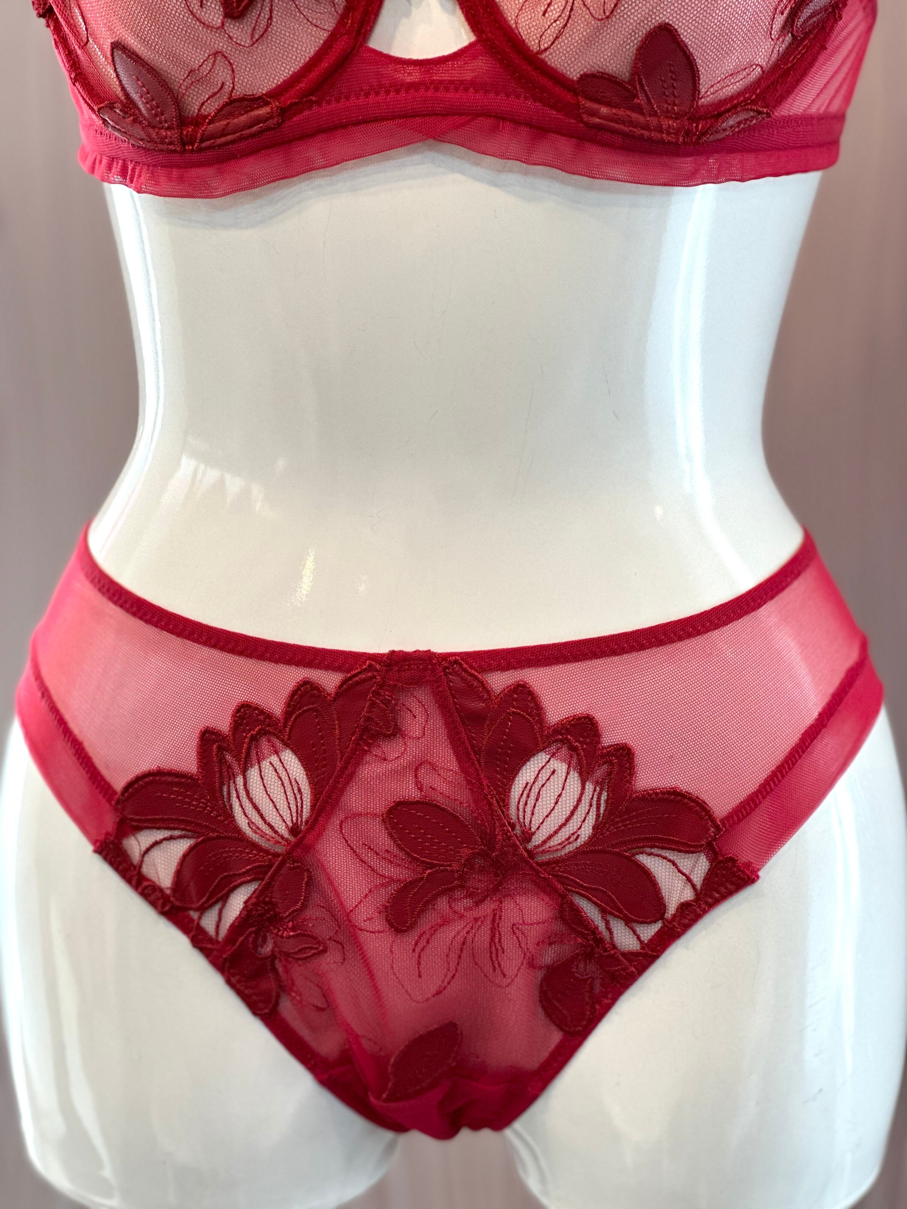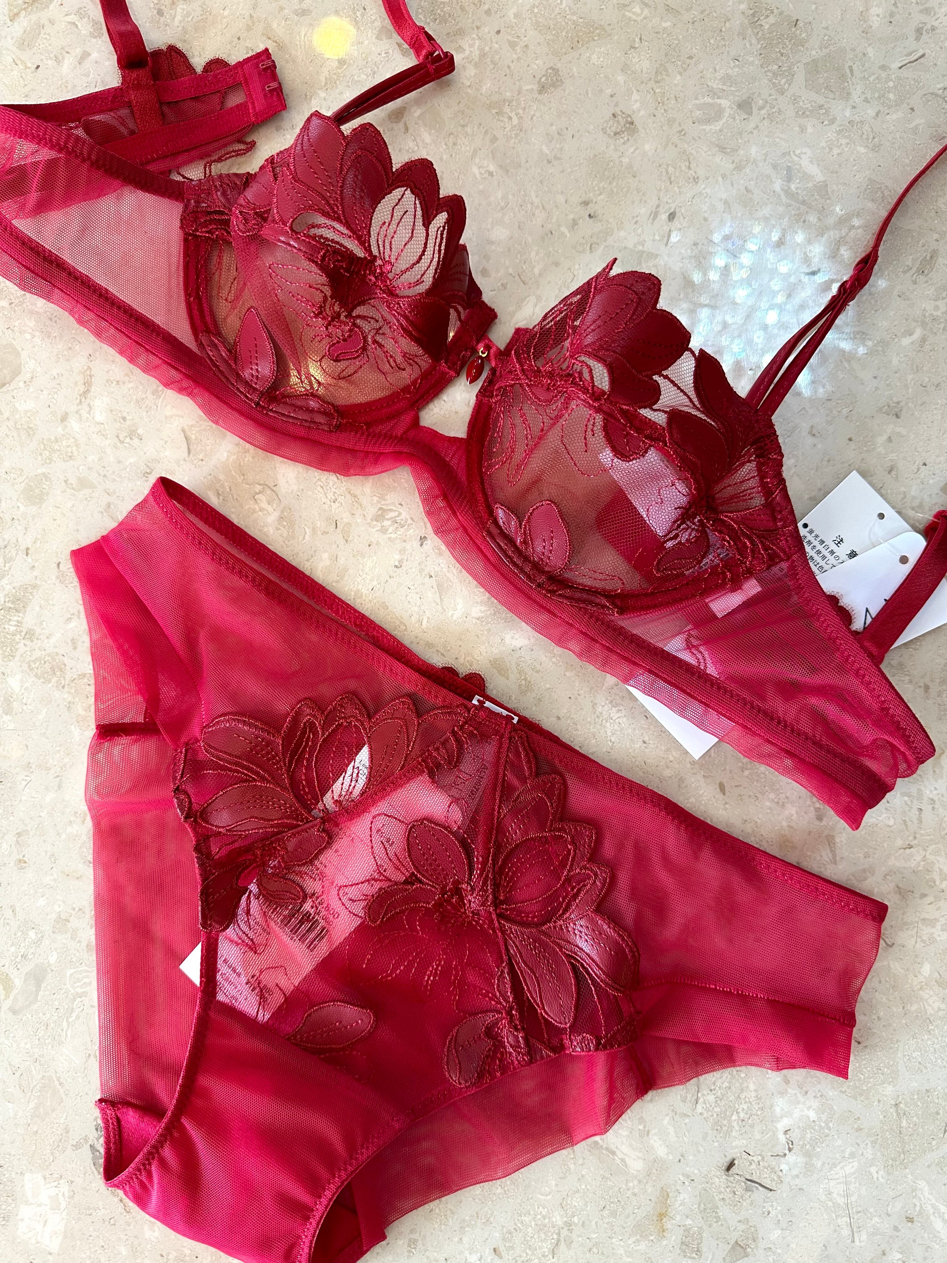 透明なチュールに刺繍とレザー調の素材をミックスした華やかで官能的なラインです。
