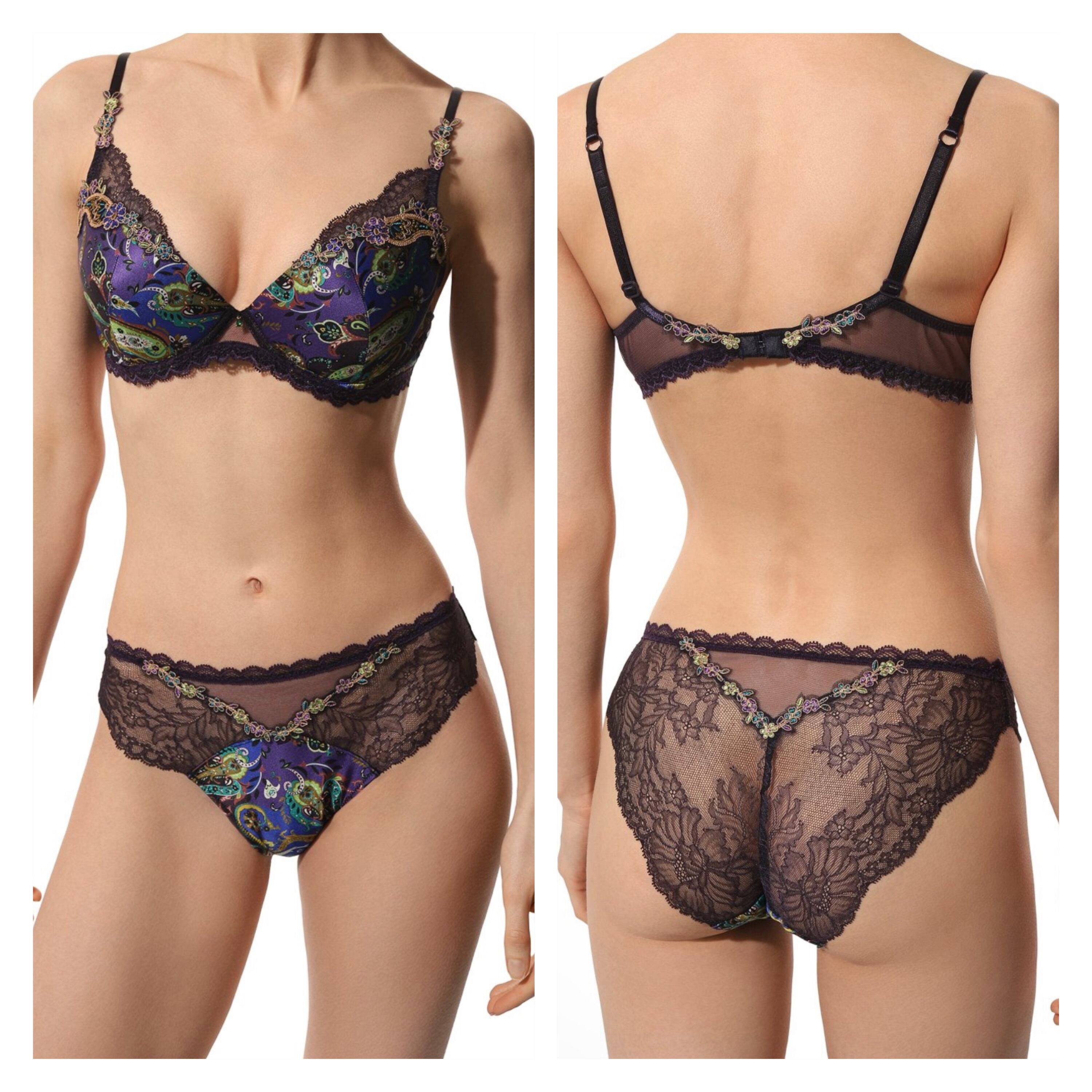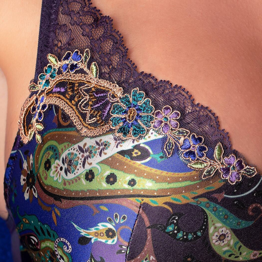 美しいシルクプリントの豪華さとレースの繊細さが、洗練された官能的なシルエットを