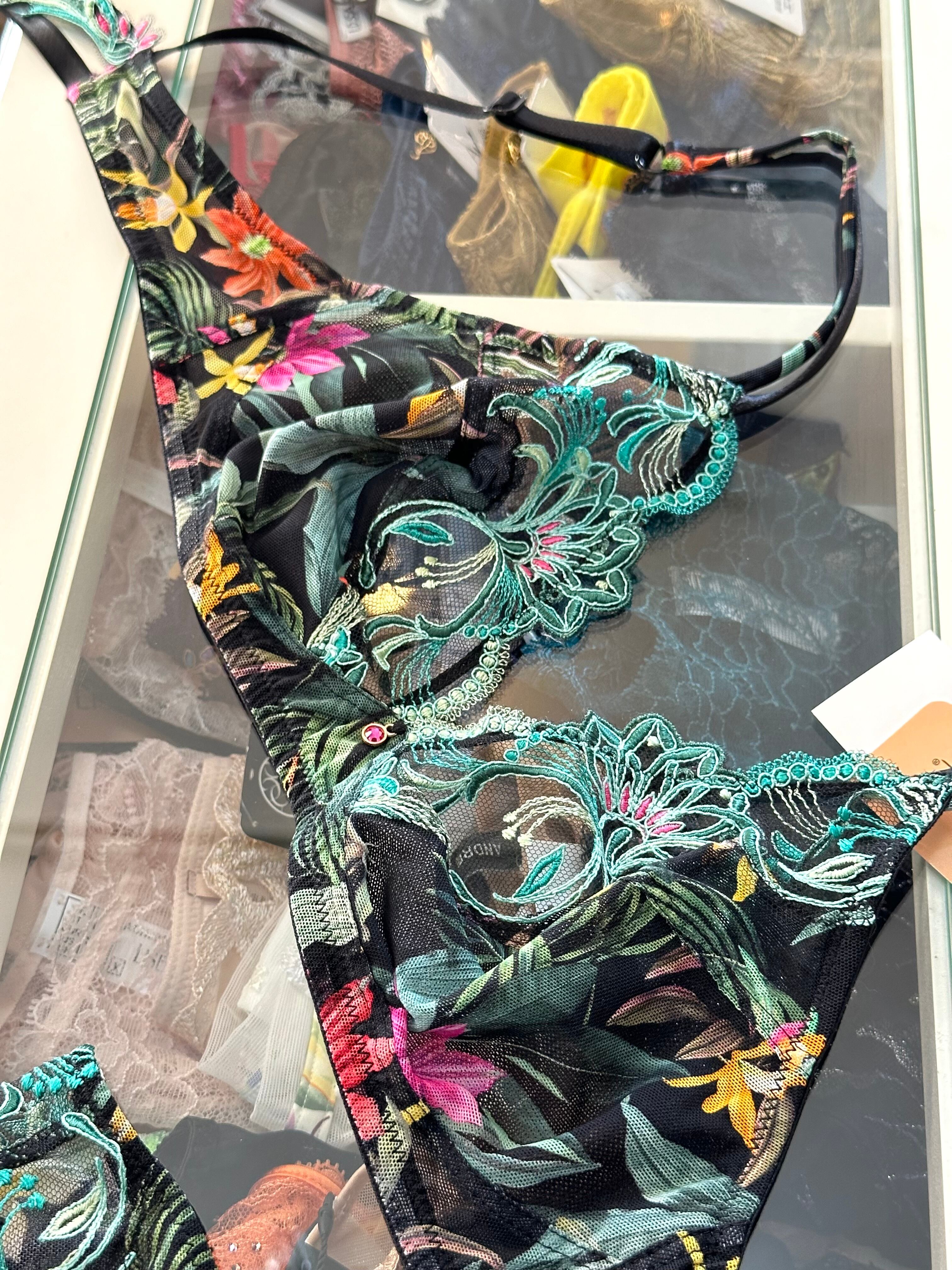 ブラジャーショーツは花柄プリントのチュールと透明度の高いオリジナルデザインの刺繍で