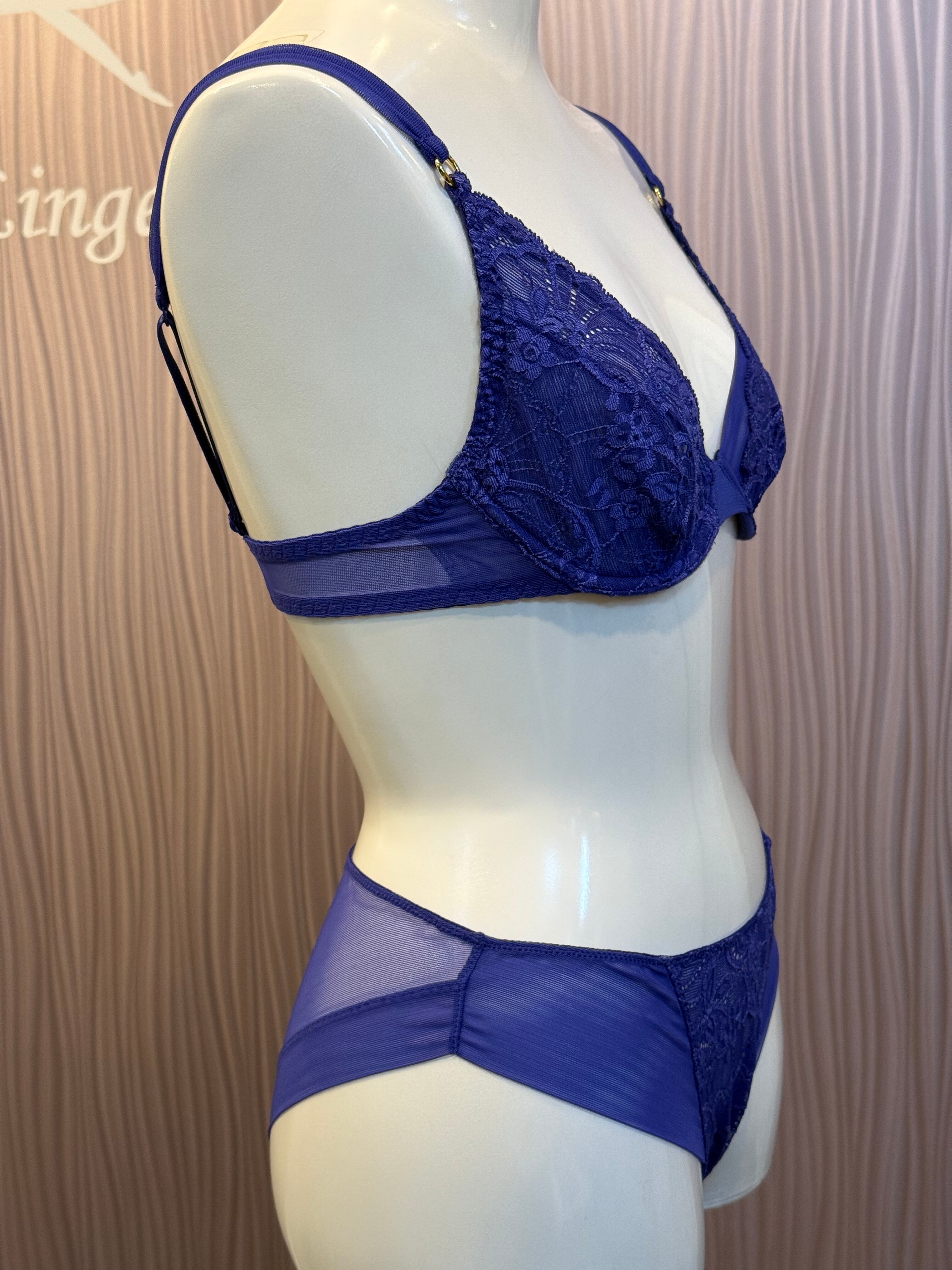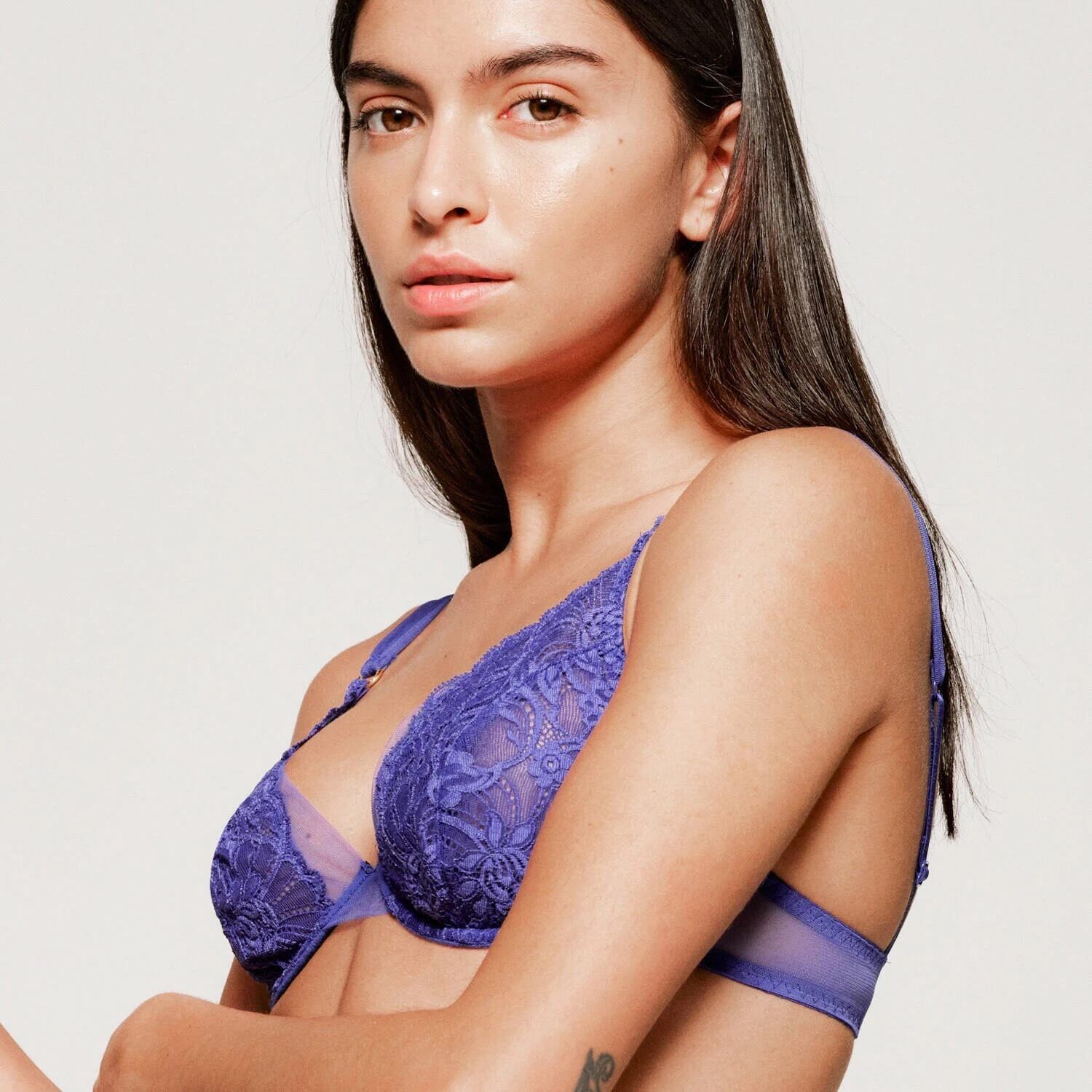 完璧なプランジ・シェイプに透明チュールとフランス製レースを組み合わせ、二重の谷間を演出。ゴールドのリングが印象的な、とても柔らかいチュールのショルダーストラップを仕上げています。
